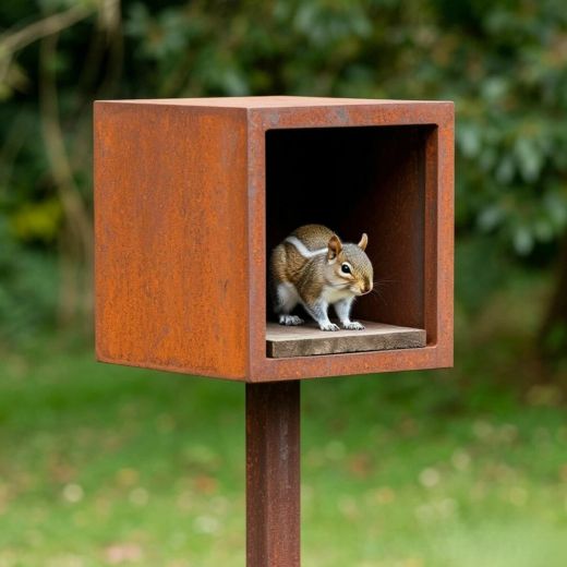 Металлический домик для белок «Куб на опорной ножке» — это оригинальный и функциональный предмет садового декора, выполненный из прочного металла. Такая кормушка способна стать украшением участка и служить местом обитания для лесных обитателей.